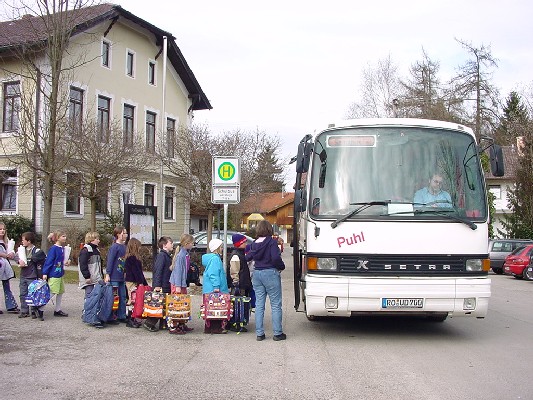 Die Helfendorfer Grundschule in AyingDa fahre ich jeden Morgen mit dem Schulbus hin, außer wir haben Ferien, oder es ist Wochenende. Eingeschult wurde ich im September2000 (Pressebericht), also bin ich in der vierten Klasse. Davor ging ich in den Kindergarten Wilde Wiese.