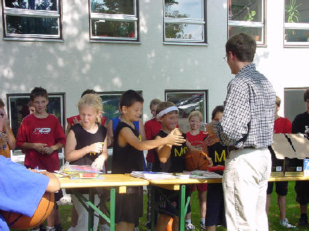 Am 27. September fand ein Streetball-Turnier in Glonn statt (siehe auch die Ankündigung). Es spielten Mannschaften von Minis bis Erwachsene. Ich trat zusammen mit Jana, Franziska und Leo als "Minitigers" mit selbstgemachten Trikots an. Wir habe unter den Minis auch gesiegt, leider durften wir das Wanderpokal nicht mitnehmen, weil der Bürgermeister wollte, dass es in Glonn bleibt!