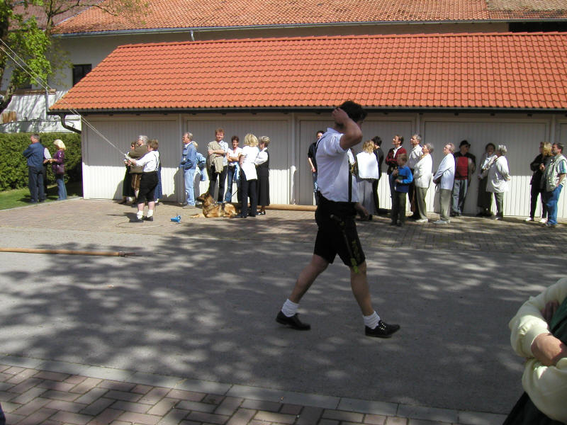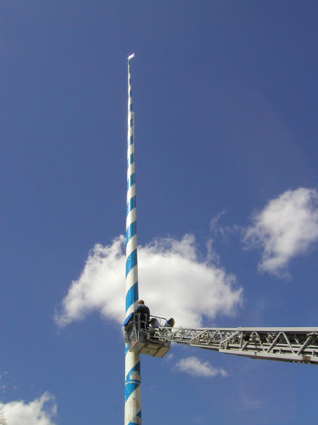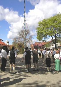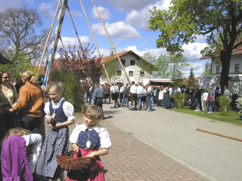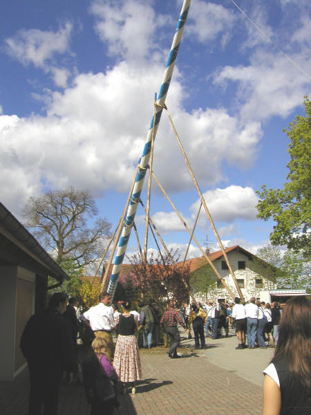 Hallo, nach 5 Jahren war es 2003 wieder fällig: Maifest in Dürrnhaar! Kinder, Eltern, alle hatten sich fesch gemacht. Die meisten erschienen in Tracht und versammelten sich schon früh am "Festplatz". Die Burschen zogen schon unter fachmännischer Anleitung den Maibaum mit purer Muskelkraft hoch. Die, die nicht Arbeiteten, konnten frühstücken. Später kam der Umzug der Burschenvereine und der Tanz der Figuren. Die "Gaudi" dauerte bis zum Abend. Hans, Ernst und Papa wollten sich aber alles lieber von oben anschauen und gingen fliegen.